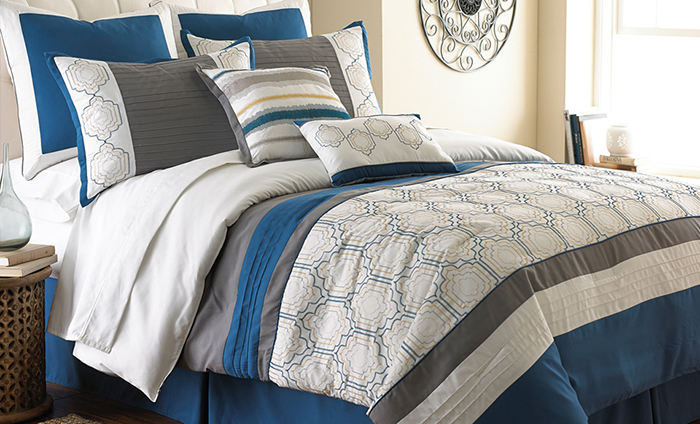 Set includes - One Oversized-Overfilled Comforter Two Embellished Shams One Tailored Bedskirt 2 Embellished Euro shams Two Decorative Embellished Pillows (filled)